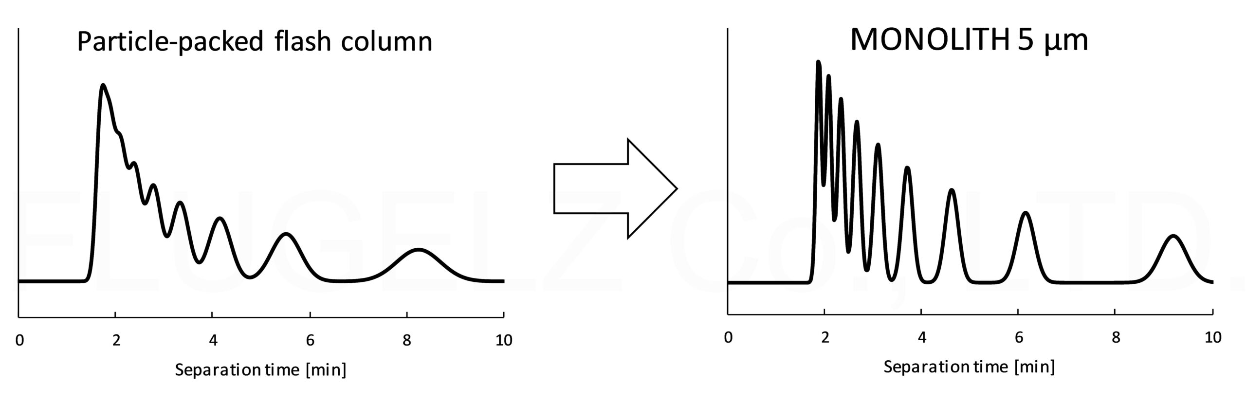 従来のシリカゲル粒子を用いた精製カラムでは、分離性能が低く高純度化が困難、大量の充填材 & 溶媒廃棄物が発生してしまう、精製プロセスに長時間必要、大型カラムが必要で設備コスト高、といった問題点を一度に解決することができます。
